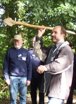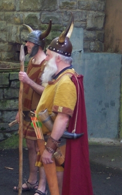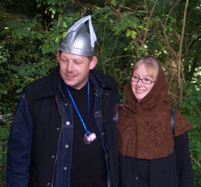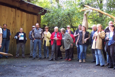 | Etwa gegen 11.30 Uhr bestiegen wir einen Omnibus und der Regen war auch vorbei. Das Fahrziel war immer noch nicht bekannt, doch schon bald merkten wir, dass es in Richtung Hameln ging. Dann sogar an Hameln vorbei. Im Emmerthal bogen wir von der Bundesstraße ab zu einem ersten Halt. Einige kannten sich in der Gegend gar nicht mehr aus. Die Strecke führte an der Weser entlang bis nach Höxter-Albaxen zur rustikalen Waldgaststätte „Rübezahl“, etwas außerhalb des Ortes gelegen. Nach kurzer Einkehr wurden wir alle ins Freie gebeten. Es erwartete uns der Germanenfürst Wotan in seinem historischen Gewand. Wir mussten nun auch unsere germanische Geschicklichkeit beweisen. Zuerst wurden Freiwillige gesucht, die einen rustikal gezimmerten Wagen mit Galgenbaum in eine bestimmte Position schieben bzw. ziehen mussten. Michael Tasch und Kathrin Zack wurden die Anführer unserer Gruppe und mit germanischen Insignien versehen. So durfte Michael stolz einen Germanenhelm tragen, während Kathrin sich mit einer Germanenkapuze begnügen musste (durfte). |