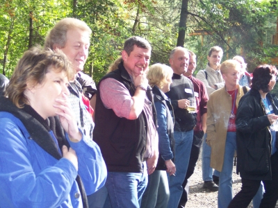 | In den Morgenstunden des 2. Oktober 2004 startete unsere diesjährige Fahrt ins Blaue, die von unserer Festleiterin, Petra Lahmann, wieder gut vorbereitet und ausgerichtet war. Aber - welch ein Graus der Himmel hatte ausgerechnet an diesem Morgen seine Schleusen geöffnet. Es schien zumindest schon mal von außen ein feuchter Tag zu werden. 27 Mitglieder und Gäste hatten sich pünktlich um 10.00 Uhr im Vereinslokal „Zum Stern“ gut gelaunt eingefunden, in entsprechender Wetterbekleidung natürlich. Die Festleitung erwartete uns bereits am reichhaltig gedeckten Frühstückstisch und zur Begrüßung gab es erst einmal ein Glas Sekt. Voller Spannung wurde die Lüftung des Geheimnisses erwartet, wohin es am heutigen Tage wohl gehen und was uns erwarten würde. Doch erst einmal hieß es, seinen Grips anzustrengen. Ein Fragebogen wurde an die Teilnehmer ausgehändigt, der es in sich hatte und den wir im Laufe des Tages dann bei der Festleitung wieder abgeben sollten. Die Fragen drehten sich um Allgemeinwissen, es waren verzwickte Scherzfragen darunter und auch Geschicklichkeit im Umgang mit vermeintlich wahllos aufgeführten Buchstaben war gefordert. Diese sollten restlos wieder zu Städtenamen zusammengesetzt werden. |